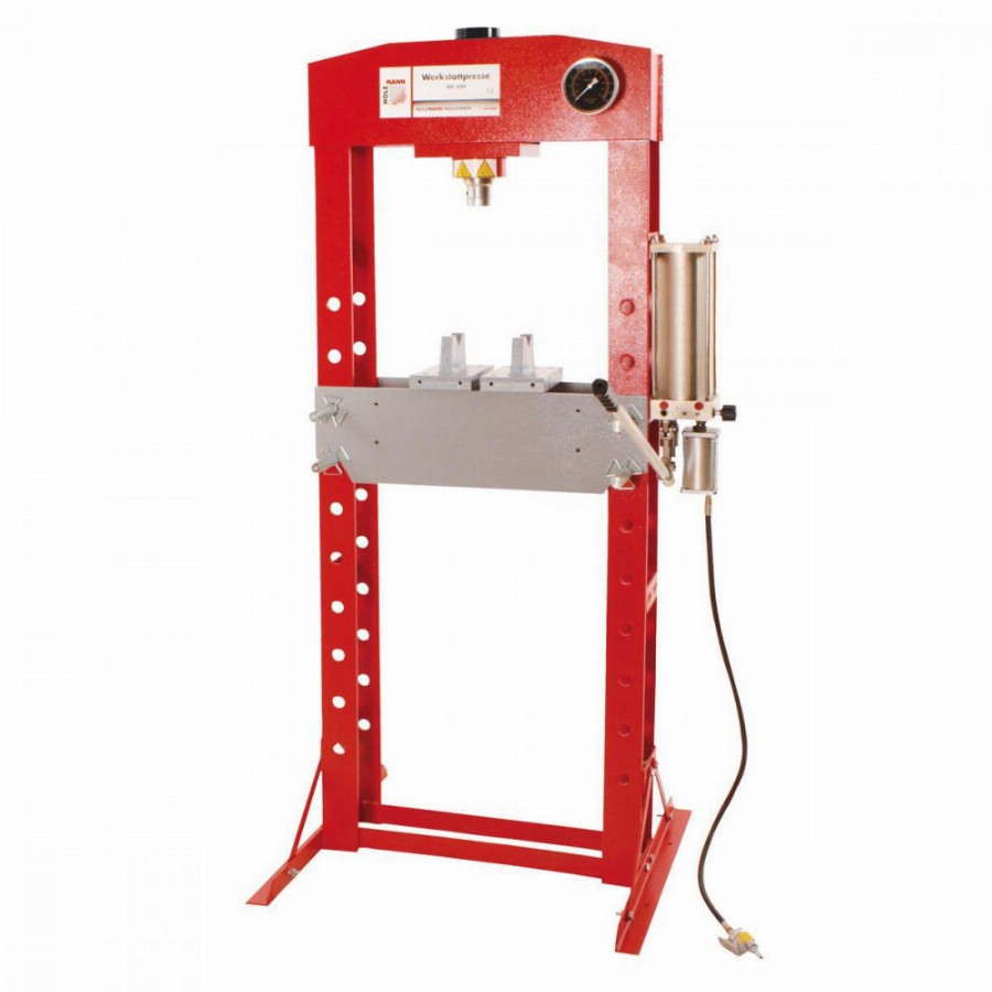 kényelmes sajtolási, hajlítási és egyengetési munkákhoz manométer jelzi a nyomóerőt tökéletes műhelyi segítség a karbantartáshoz és összeszereléshez Tömör egyfokozatú pneumatikus hidraulikus henger automatikus dugattyú-visszatérés Állítható asztalmagasság Asztalmagasság beállítása forgattyús karral Nyomásszabályozás manuálisan hidraulikus kézi szivattyúval v