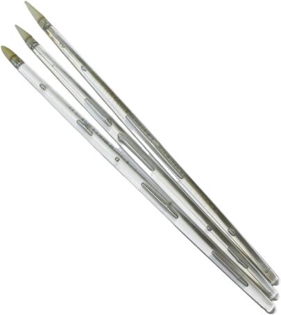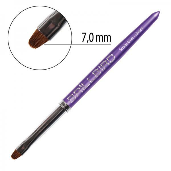 Természetes szőrű porcelán műkörömépítő ecset. Kifejezetten tanulók számára!Speciálisan lapított töve és pontban végződő hegye megkönnyíti az anyag eligazítását és a szép mosolyvonal kialakítását. Kisebb mérete miatt rövid és extra rövid körmökhöz, vagy kisebb anyagmennyiséggel való munkához ajánljuk.
