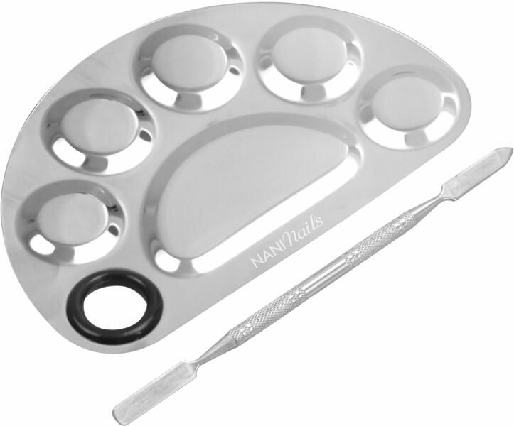 A NANI paletta ideális színes zselék és körömdíszek vagy színes porcelánporok stb. keveréséhez. Praktikus kialakítás a kényelmes fogásért, amely tökéletes kényelmet nyújt munka közben. A szett bőrfeltolót is tartalmaz, amely a színek keveréséhez is használható. Fém kivitel. Mérete: 160 x 99 mm