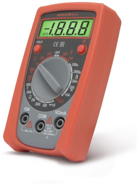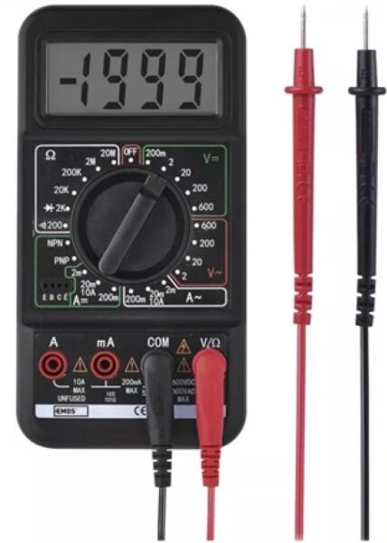 Termék részletek- Tartomány kiválasztása manuális - AC feszültség 2–600 V - AC áram 2 mA 10 A - DC feszültség 200 mV 600 V - DC áram 2 mA 10 A - Elektromos ellenállás 200 Ohm 20 MOhm - Vezeték folytonossága...
