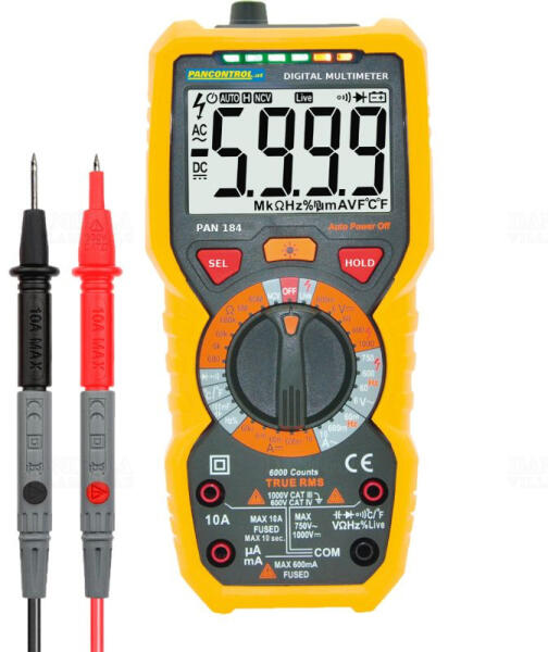 Termék részletekMultiméter digitális, professzionális True RMS PAN 184 Pancontrol***(Egyenfesz. : 0,1V-1000V; Vált. fesz. : 1mV-750V; Egyenáram: 0,01 A - 10 mA; Vált. áram: 10 A - 10A; Ellenállás: 0,1 ohm - 60 Mohm ; Frekv. :0,001 Hz - 10 MHz; Kap. : 1 pF - 100 mF; Pont. : 0,5 % - 5%; Hőm. : -20°C - +1000°C) Valódi RMS (True RMS Measurement) Érintés nélküli feszültség detektor, 3 fokozatú (NCV