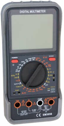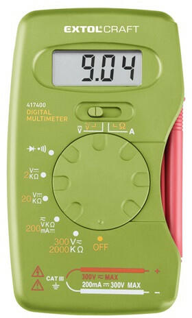 Termék részletekdigitális multiméter; Amper/Volt/Ohm mérő, hangjelző funkcióval, CE, 1 db 9V elem A digitális multiméter egyenáram, egyenfeszültség, váltakozó feszültség, ellenállás mérésre és dióda ellenőrzésre szolgál. Kijelző mező: folyadékkristályos Max. mérhető feszültség: 300V Működési körülmények: 0-50°C, 35°C hőmérsékletig a páratartalom