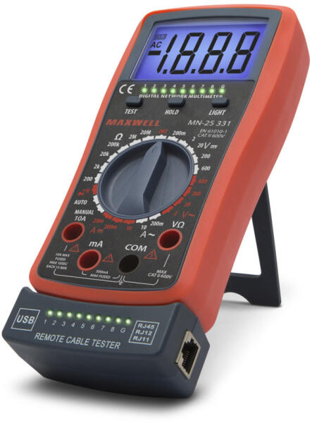 Termék részletekDigitális multiméter - kábel teszterrel 2 az 1-ben műszer, általános multiméter funkciókkal, kábeltesztelő egységgel kiegészítve. A kontroll egység levehető és szabadon hordozható. RJ11, RJ12, RJ45 és USB vezetékek teszteléséhez alkalmazható. Dióda teszt Folytonossági teszt Adattartás Hangjelzés Háttérvilágítás Kábelteszt funkció (USB, RJ11, RJ12, RJ45) Tartozék: