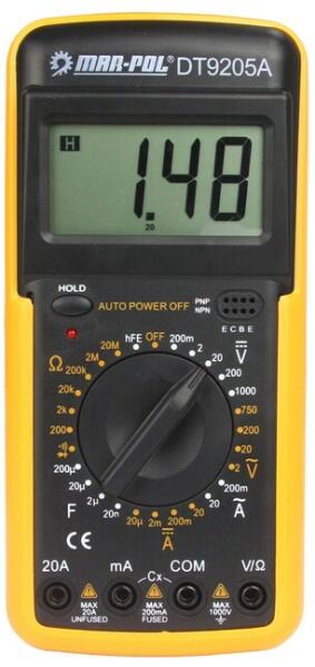 Termék részletekDigitális multiméter DT-9205AOtthoni használatra és profiknak egyaránt. Optikai hibajelzés. Gyenge akkutöltöttség kijelző. Az állítható állvány lehetővé teszi az értékek egyszerű leolvasását az LCD kijelzőről. Védőgumival felszerelve ütközés ellen. Technikai paraméterek:DCV feszültség: 200 mV - 1000 V (+ / - 0,5% + 1) ACV feszültség: 20mV - 700V (+ / - 1,2% + 3) A