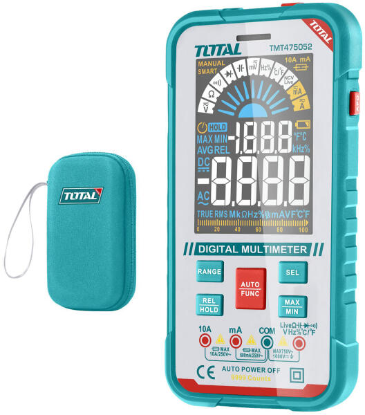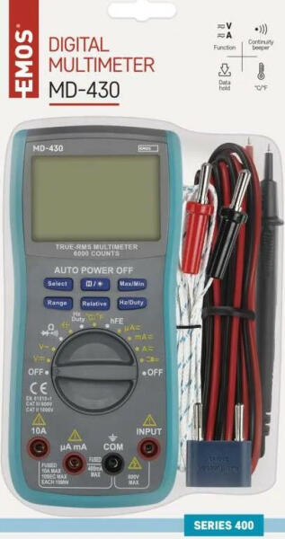 Termék részletekMűszaki adatok: - Kijelző: 4 digit / 22 mm karaktermagasság - DC V: 0,01 mV - 1000 V - AC V: 0,01 mV - 750 V - DC A: 0,1 A - 10 A - AC A: 0,1 A - 10 A - Ellenállás: 0,1 - 40 M - Hőmérséklet: -20 - (+1000)°C / -40 - 1832°F - Frekvencia: 0,001 Hz - 10 MHz - Biztosíték: FF500 mA/1000V, FF10A/500V - Pontosság: +-0,5 - 5% (lásd használati útmutató) - Energiaforrás: 1 x 9V elem (nem ta
