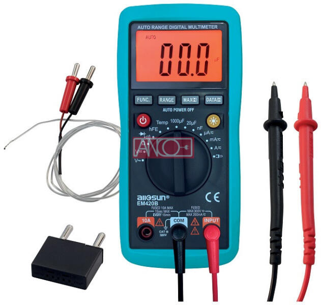 Termék részletek450104 - CAT III - 3½ elemű kijelző (maximum: 1999) - egyen- és váltakozó feszültség mérése (AC) 2V - 300 V (DC) 200 mV - 300 V - egyenáram mérése (DC) 200 A - 10 A - mérési ellenállás 200 - 20 M - mérési kapacitás 20 nF - 1000 F - mérési hőmérséklet -20°C - 1000°C (0°F - 1800°F) - diódák tesztelése, valamint a vezetőképesség és az áramkörök (PNP és NPN) hal
