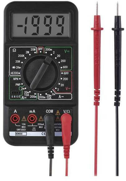 Termék részletekDCV: 200 mV / 2000 mV / 20 V / 200 V / 500 V ACV: 200 mV / 500 V DCA: 200uA / 2000 uA / 20 mA / 200 mA / 10 A Ellenállás mérés: 200 / 2000 / 20 K/ 200 K / 20 M /200 M ohm Dióda mérés Folytonosság mérés, hangjelzés Hőmérséklet mérés: -40 °C-1370 °C / -40 °F-1832 °F K típusú hőmérséklet érzékelő + mérővezetékek Tápellátás 9V, elem nem tartozék