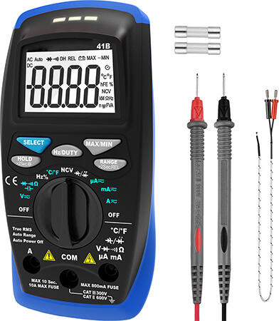 HoldPeak 41B feszültségtesztelő multiméterA multiméter főbb jellemzői Feszültségtesztelő multiméter. LCD kijelző 4 számjeggyel, háttérvilágítással. DC feszültség mérési tartomány: 600 mV - 600 V. DC feszültség kijelzés: 0,1 mV, 1 mV, 10 mV, 100 mV, 1 V. AC feszültség mérési tartomány: 6 mV – 600 V. AC feszültség kijelzés: 1 mV, 10 mV, 100 mV, 1 V. Áramerősség