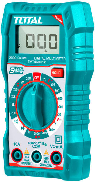 Digitális multiméter 0012/ CATIII600V (TMT460012) A TOTAL TMT460012 digitális multimeter a feszültség, az áram és az ellenállás pontos mérésére szolgál egyenáramú és váltakozó áramok esetén. Nélkülözhetetlen eszköz az elektromos munkákhoz. A multimeter folyadékkristályos LCD kijelzővel (2000 RMS) rendelkezik, ami tisztán mutatja a mérési eredményeket. A mérési tar
