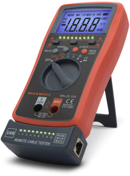 Digitális multiméter, automata, kábel teszterrel 2 az 1-ben műszer, általános multiméter funkciókkal, kábeltesztelő egységgel kiegészítve. A kontroll egység levehető és szabadon hordozható. RJ11, RJ12, RJ45 és USB vezetékek teszteléséhez alkalmazható. Automata méréshatár váltás a még kényelmesebb használatért. Dióda teszt Folytonossági teszt Adattartás Automata m