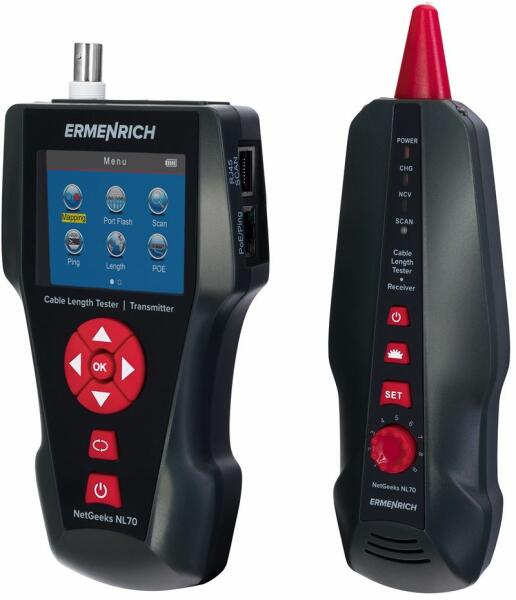 Az Ermenrich NetGeeks NL70 kábelhossz tesztelő egy többfunkciós mérőszerszám különféle hálózati kábelek (5E/6E kategória), telefonkábelek, koax kábelek és közönséges vezetékek tesztelésére. Az eszközzel akár 1000 méter hosszú kábelek is tesztelhetők. A készletben 8 távegység található, így egyszerre 8 mérés végezhető. Az Ermenrich NetGeeks NL70 eszközzel ár