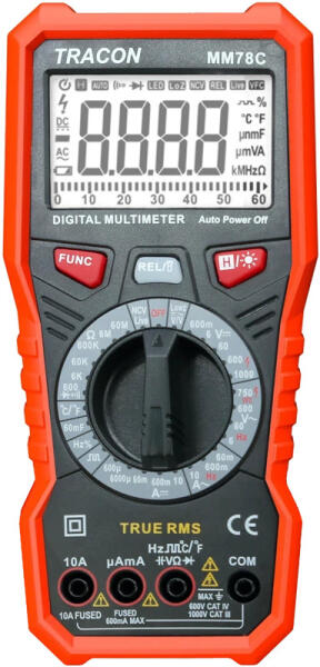 Tracon MM78C Digitális multiméter TRMS ACV, DCV, ACA, DCA, TRMS, Ohm, Hz, C, °C, dioda, NCV, signal Jelzés/kijelző: digitális Többszörös jelzés: Igen Kijelző háttérvilágítással: Igen Mérési tartomány választása: kézi Max. feszültségmérési-tartomány AC: 750 V Legkisebb felbontás, váltakozófeszültség: 1 mV Max. feszültségmérési-tartomány DC: 1 000 V Legkisebb fel