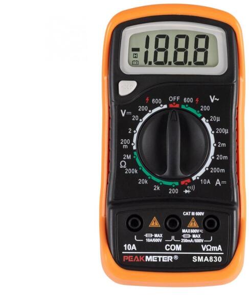 - ---------- MÉRÉSTARTOMÁNY ---------- Egyenfeszültség: 200 mV/2 V/20 V/200 V/1000 V; ±(0,5%+3) Váltakozó feszültség: 200 mV/2 V/20 V/200 V/1000 V; ±(0,5%+10) Egyenáram: ±(0,5%+5) Váltakozó áram: 2000uA/20 mA/200 mA/200 mA/200 mA/200 mA/2 A/20 A; ±(0,8%+10) Ellenállás: 200 Ohm/2 kOhm/20 kOhm/2 MOhm/2 MOhm/20 MOhm/200 MOhm; ±(0,3%+2) Kapacitás: 2000 uF; ±(4%+20) Frekvencia: 10