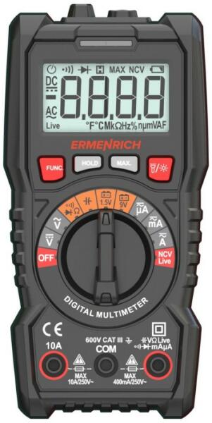 Ermenrich Zing TC13 digitális multiméterAz Ermenrich Zing TC13 digitális multiméter egy multifunkcionális, hordozható eszköz, mely az elektromos hálózatok tesztelésére és az elektromos jel jellemzőinek mérésére szolgál. A készüléket szakemberek általi professzionális használatra tervezték, de háztartási feladatokra, laikusok számára is alkalmas. A feszültség, az áram