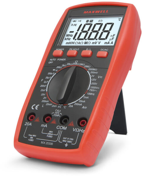 - Digitális multiméter mérőzsinórral, aligátor csipesszel. - Mérési funkciók: VDC, VAC, ADC, AAC, ellenállás, dióda, kondenzátor, hőmérséklet, frekvencia. - VDC feszültség mérési tartomány: 60 mV - 1000 V. - VAC feszültség mérési tartomány: 60 mV - 750 V. - ADC áramerősség mérési határ: 600 μA - 20 A. - AAC áramerősség mérési határ: 600 μA - 20 A. - Ellenál