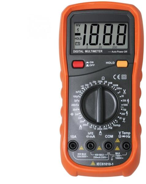 MÉRÉSTARTOMÁNY Egyenfeszültség: 200 mV / 2000 mV / 20 V / 200 V / 600 V ±(0,5%+2) Váltakozó feszültség: 200 V / 600 V ±(1,2%+3) Egyenáram: 2000 A / 20 mA / 200 mA / 200 mA / 10 A ±(1%+2) Ellenállás: 200 Ohm / 2000 Ohm / 20 kOhm / 20 kOhm / 200 kOhm / 20 MOhm / 200 MOhm ±(0,8%+2) Diódateszt Áramkör folytonossági ellenőrzés KIEGÉSZÍTŐ FUNKCIÓK A mérési tartományok kézi