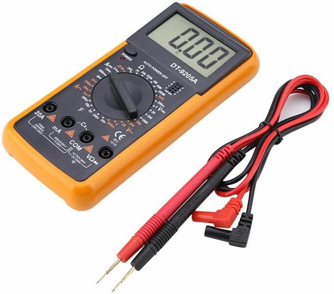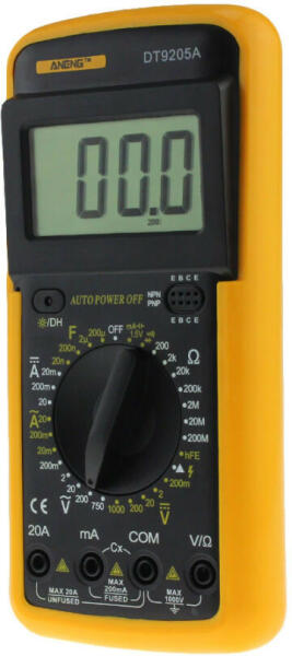 Digitális multiméter DT9205A A DT9205A készülék egy digitális multiméter, kizárólag hobbi felhasználásra. Segítségével AC és DV feszültséget, DC áramot, ellenállást tudsz mérni. Tranzisztorokat, diódákat tesztelhetsz. 1 darab 9 voltos elemmel üzemeltethető. - 3,5 digites 25mm méretű számkijelzésű LCD kijelző - DCV: 200mV - 1000V - ACV: 200mV - 750V - DCA: 2mA - 20A -
