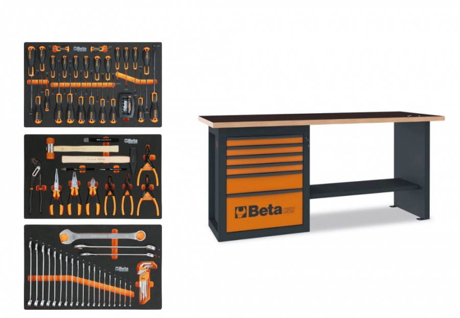 Ez a munkaasztal komplett és sokoldalú a nagy, két méteres rétegelt lemez munkalapnak és a tágas, fix, 6 fiókos komódnak köszönhetően. A szerszámokat rendszerben helyezheti el, és mindent elérhető helyen tarthat munka közben. A fiókok teleszkópos golyóscsapágyas csúszdákra vannak felszerelve, tetejük pedig kiterjesztett gumiszőnyeggel van védve, hogy ne sértse meg a bels