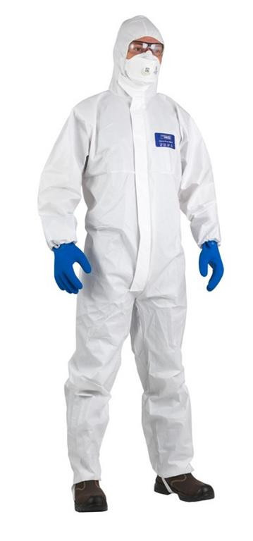 COVERPRO 5M30 OVERALL FEHÉR • fehér színű, bolyhosodás mentes mikroporózus filmréteggel bevont, kapucnis, 65 g/m2 vastag, szilikon mentes polipropilén overall • véd porok, fröccsenő folyadékok és vegyszerek, illetve biológiai kockázatok és radioaktív szennyeződésű részecskék ellen, kiváló antisztatikus tulajdonsággal • öntapadós védőhajtókával ellátott cipzár