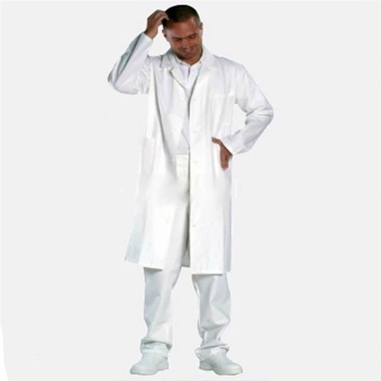 FEHÉR TEXTIL KÖPENY: • fehér színű, 230 g/m² vastag, kiválóan szellőző, testbarát 100% pamut alapanyag, mely 90°C-on is mosható • KÖPENY: 4/4-es (120 cm) galléros, egyenes szabású, gombos „orvosi” köpeny három zsebbel • méret: 46 • EU szabvány: EN340
