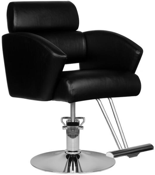 Modern fodrász szék a HAIR SYSTEM-től. Elegáns és nagyon kényelmes. A masszív krómozott talapzat garantálja az ülés stabilitását. A kárpitozás kiváló minőségű fekete öko-bőrből készült. A szék felfelé és lefelé állítható