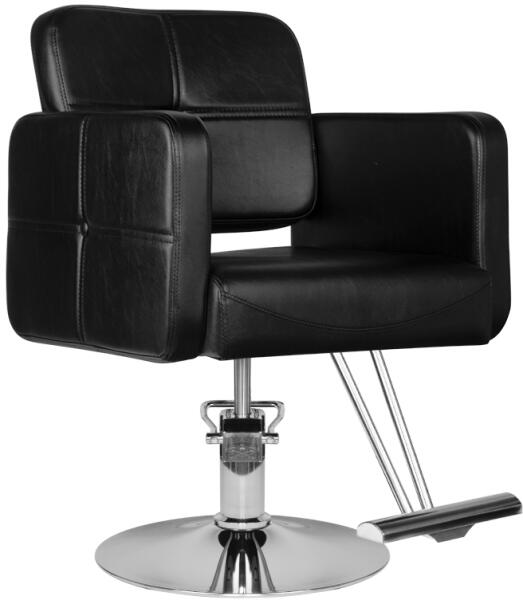 Modern fodrászszék a HAIR SYSTEM-től. Elegáns és nagyon kényelmes. A masszív krómozott talapzat garantálja az ülés stabilitását. A kárpitozás kiváló minőségű fekete öko-bőrből készült. A szék felfelé és lefelé állítható