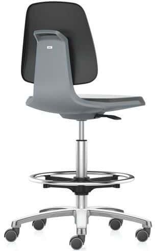 Antisztatikus munkaszék görgőkkel és lábtartóval. Alkalmas egyetemi, orvosi, gyógyszerészeti, biotechnológiai vagy vegyipari helyiségekben. Mosható és ellenáll a fertőtlenítőszereknek. Egyenletes ülésmagasság-állítás 560 és 810 mm között.
