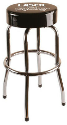 Fix kialakítású szerelőszék (bárszék) puha szivacsos ülőrésszel, bőr huzattal, Laser Tools Racing logóval. 370 mm átmérőjű ülés, 80 mm vastag párna. Az ülés 360 fokban forgatható. 720 mm magas. Krómozott keret gumi lábakkal. Súly: 6,2 kg Szín: króm - fekete