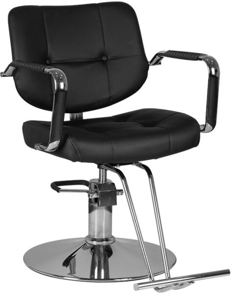 Modern fodrász szék modern dizájnnal. Nagyon kényelmes, tökéletesen alkalmas a modern szalonok számára. Speciális alakú, hogy az ügyfélnek kényelmes pozíciót biztosítson az alkalmazás során. Függőlegesen állítható. Nagyon stabil és szilárd. Kiváló minőségű ökobőrből készült borító. Fekete szín.