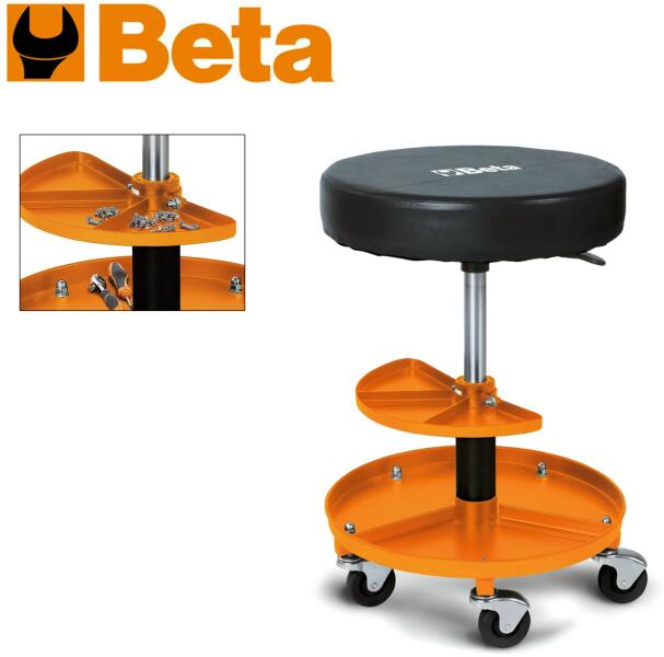 Beta - Italy Forgatható kényelmes gumival bevont ülőfelületű 5 kerekes szerelőszék Közép magasságban a dugattyú házára fogatott tartó fakkal, a könnyebb szerszám, alkatrészek tárolására. Tulajdonságok: - Forgatható kerek ülőlap - Gázdugattyús magasság állítás (410-530 mm) - 2 szereléktartó/szerszámtartó, amelyek egyike magasságában állítható - 5 elforduló k