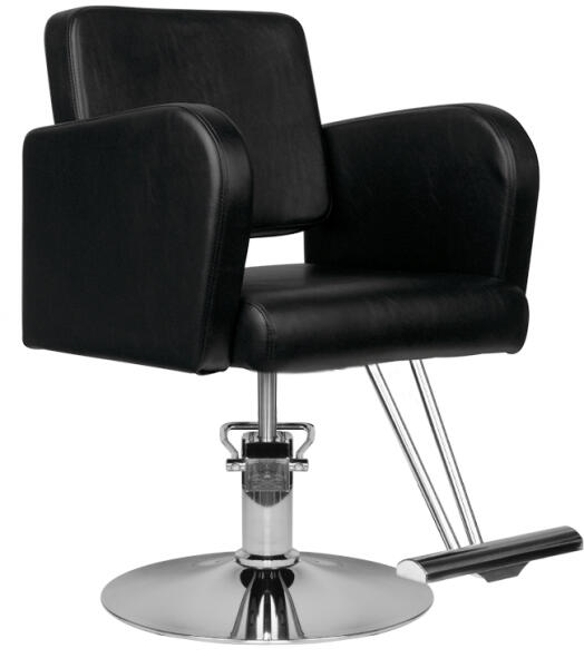 Modern fodrász szék a HAIR SYSTEM-től. Elegáns és nagyon kényelmes. A masszív krómozott talapzat garantálja az ülés stabilitását. A kárpitozás kiváló minőségű fekete öko-bőrből készült. A szék felfelé és lefelé állítható