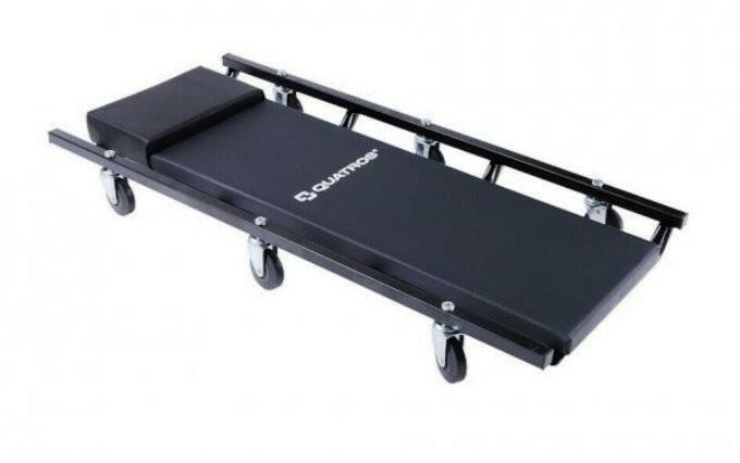 QUATROS TOOLS Gurulós aláfekvő. Termék jellemzők és paraméterei: Műbőrrel bevont szivacsos fekvőfelület és fajtámasz. Önbeálló kerekek. Masszív strapabíró fém vázszerkezet. Kényelmes, magasított fejtámasz. Hossza: 920mm. Szélessége: 425mm. Magassága: 96mm.