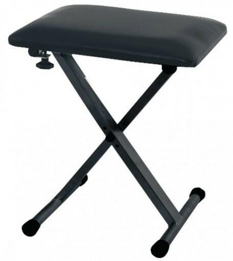 szintetizátor-pad acélcső összecsukható 3 különböző magasság állítható be rajta ülőfelület 43 x 31 cm, fekete műbőr bevonat 3 cm-es párnázat magasság 41 - 47 cm súlya 3,2 kg