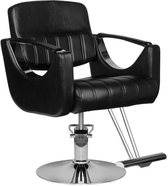 Modern fodrász szék a HAIR SYSTEM-től. Elegáns és nagyon kényelmes. A masszív krómozott talapzat garantálja az ülés stabilitását. A kárpitozás kiváló minőségű fekete öko-bőrből készült. A szék felfelé és lefelé állítható