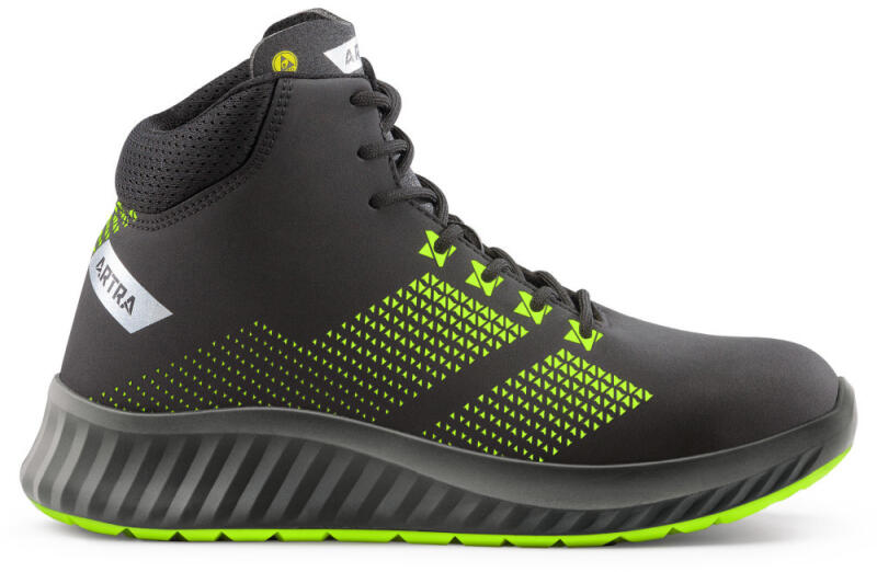 Sportos ESD-s munkavédelmi bakancs hidrofób mikroszálas nubuk bőr felsőrésszel, energiaelnyelő sarokkal és anatóniai memóriahabos talpbetéttel. A bakancs széles, anatómiai kialakítású acél orrkaplival és rugalmas, fémmentes kevlár talplemezzel rendelkezik. Felsőrész A cipő felső része hidrofób mikroszálas 2.2 mm vastag NUBUCK PRO nubuk bőrből készült, mely kiváló e
