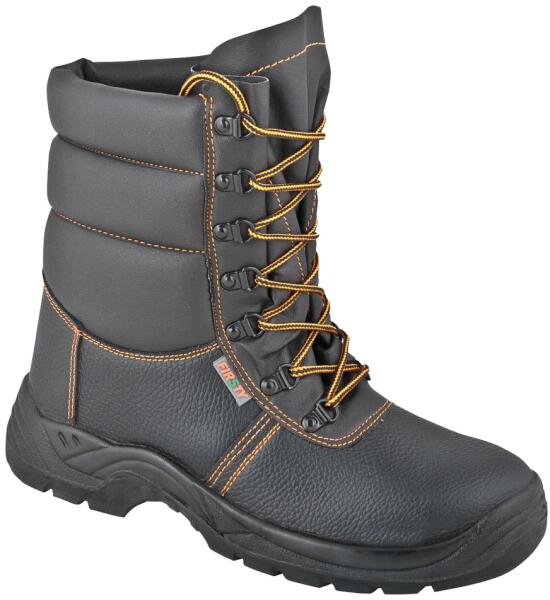 Téli munkavédelmi cipő, acél talpvédővel és fóliával, hidrofób, hőszigeteléssel, marhabőrből, narancssárga színű varratokkal, lágy kötéssel a kényelmes viselethez. A PU2D talp, olaj, üzemanyag és kontakt hőálló 110 °C-ig, antisztatikus. A 43-as méretű cipő 680 gramm súlyú. SZABVÁNY: EN 20345 (A lábbeli megfelel az EN ISO 20345 európai szabvány követelményeinek