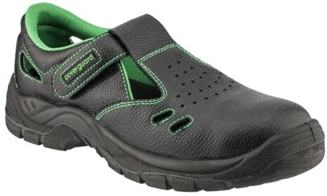 tépőzáras biztonsági védőszandál puha, bőr és poliuretán felsőrésszel antisztatikus, olajálló, hajlékony kétrétegű PU talp SRC csúszásbiztossággal energiaelnyelő sarok, kivehető nedvszívó talpbetét acél lábujjvédő leeső tárgyak ellen, átszúrásmentes fém talplemez, szivaccsal párnázott bokarész mikrószellőzős 3D hálós bélés