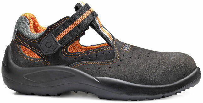 Base S1P munkavédelmi szandál velúrbőr felsőrésszel. Acél orrvédelemmel ellátott, ütéscsillapítás a saroknál. Antisztatikus és szénhidrogéneknek ellenálló egyedi kialakítású talp, a férfi és női lábnak megfelelő külön kapli szélességgel is választható. Javasolt felhasználási területek: könnyűipar, kereskedelem, szolgáltatóipar, logisztika. Felhasznált anyag
