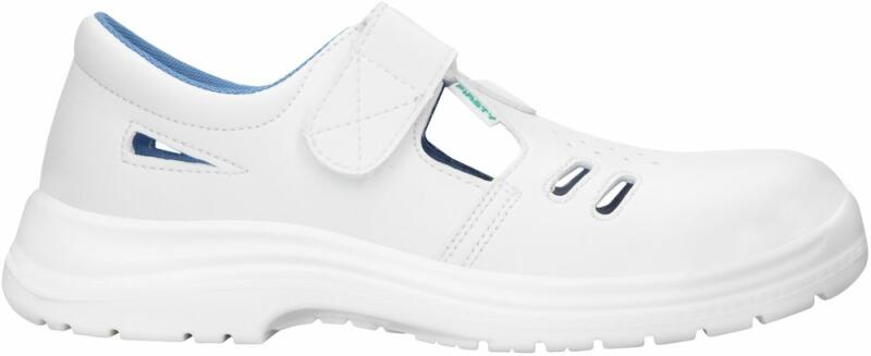Fehér szandál acél orrvédővel az egészségügy és az élelmiszeripar számára. Felső része mosható, mikroszálas bevonatú PU bőrből készül, a talp poliuretán. A cipő belsejében légáteresztő anyaggal, amely biztosítja a nedvesség felszívódását. SZABVÁNY: EN 20345 (A lábbeli megfelel az EN ISO 20345 biztonsági lábbelikre vonatkozó alap- és kiegészítő európai sza