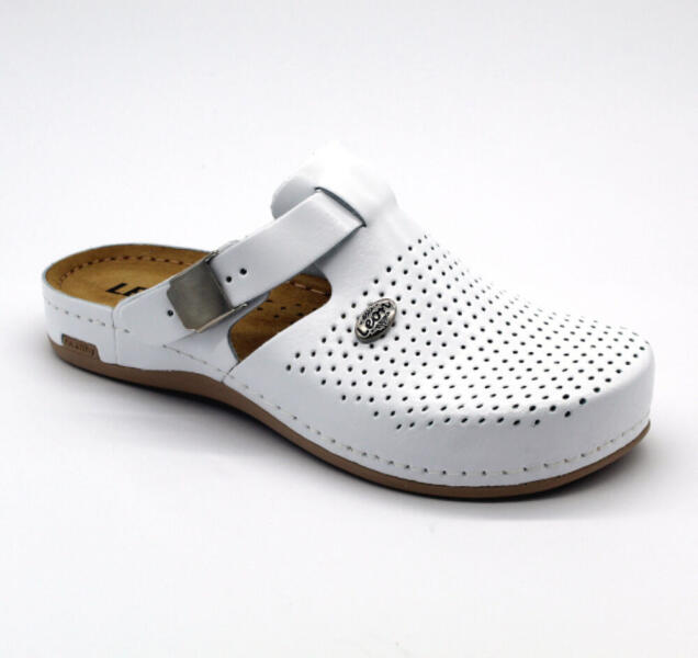 Női bőr klumpa, műanyag csúszásgátlós talppal. Oldalt csat található, amellyel szabályozni lehet a bőséget. A talpbetét puha zselés, bőr. A természetes anyagnak és a felsőrész lyukacsosságának köszönhetően , jól szellőzik. Ajánlott: mindennapos utcai használatra, otthonra vagy munkahelyre (több órás, szaladgálós munka alatt sem fárad el a láb). Ez a termékünk r