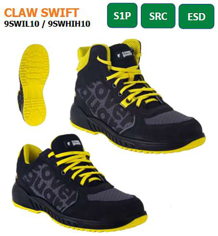 9SWIH10 CLAW SWIFT bakancs • Claw Swift egy könnyű, hajlékony és szellőző védőbakancs. • Poliészter felsőrész nubuk megerősítéssel Claw Swift optimális légáteresztést és tartósságot biztosít száraz környezetben. • Kétrétegű PU járótalpa garantálja az egész napos kényelmet. • Alumínium/kompozit, textil védelmi rendszere hozzájárul a sportos megjelenéshez