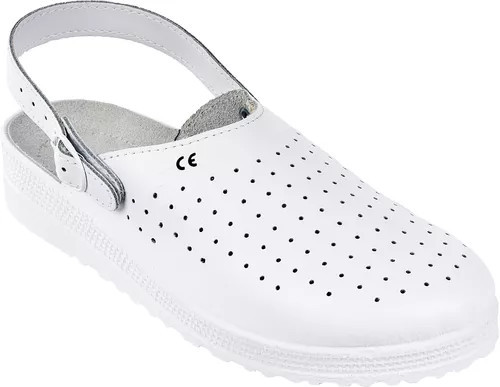 PILLE (O1) FEHÉR PAPUCS: Antisztatikus, olajálló, csúszásmentes fehér PU talp ütődéselnyelő sarokkal • fehér bőr felsőrész, hasítékbőr talpbélés, csatos sarokpánt, párnázott perem • könnyű súlyú, egészségügyi, élelmiszeripari munkákhoz, egész napos viseletre ajánlott védőlábbeli • méret: 36 • EU szabvány: EN ISO 20344, EN ISO 20347