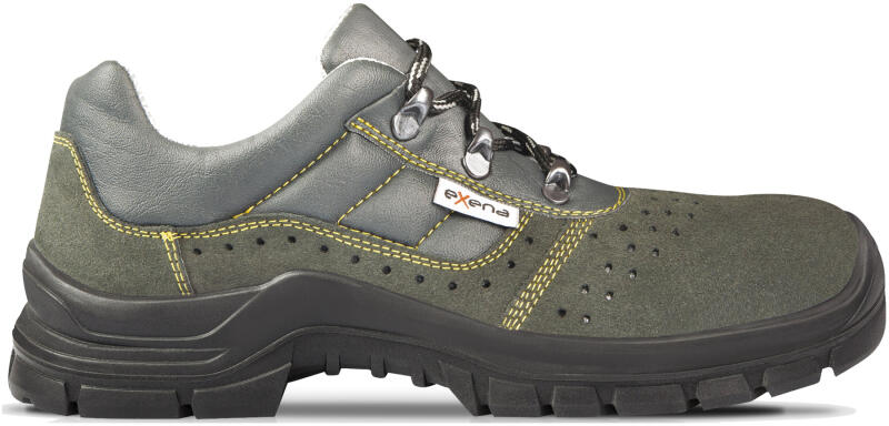 Acél orrkapli és rozsdamentes acélból készült talpátszúrás ellen védő talplemez. Exena Trasimeno_18 munkavédelmi félcipő S1P SRC: Velúrbőr felsőrész. A belső bélés lélegző, kopásálló textil. A talpbetét kivehető, párnázott, antisztatikus, C-Dry talpbetét. A talp kétrétegű, olajálló SRC csúszásmentes poliuretán talp. Antisztatikus lábbeli.