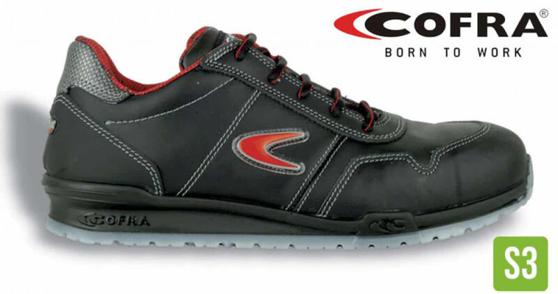 Fekete munkavédelmi cipő bőr felsőrésszel, piros Cofra logóval az oldalán, piros belső szövet béléssel. Felső része vízlepergető, talpa kopásálló. Alumínium kapli és APT talpátszúrás elleni védelem felel a védelemért. S3-as védelmi képesség! Cofra Zatopek S3 Munkacipő Futócipő jellegű, kinézetű munkavédelmi cipő fekete színben, vízlepergető bőr felsőréssz
