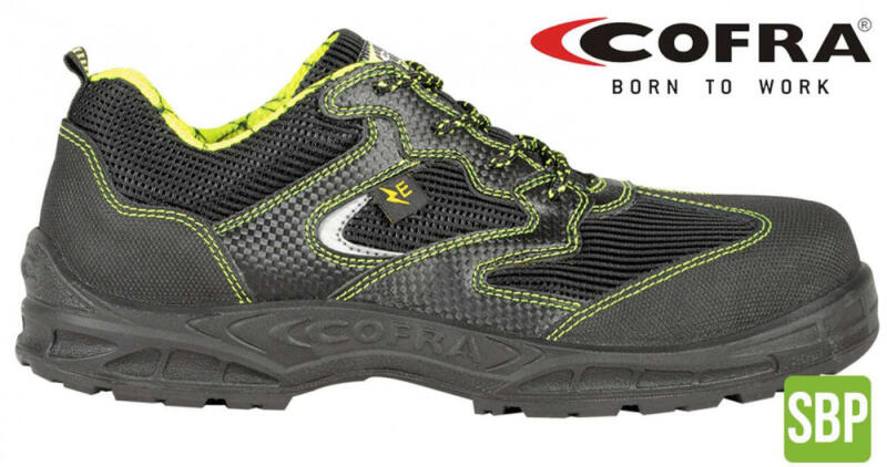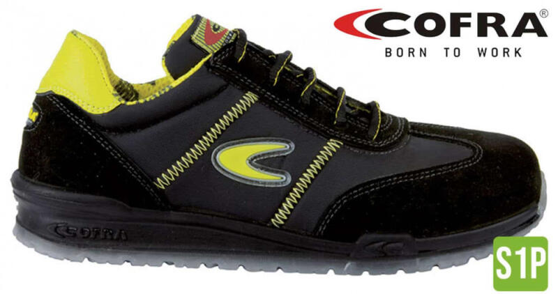 Fekete velúrbőr és szövet együtteséből készült munkavédelmi cipő, sárga szövet belső résszel. Lélegző felsőrésze biztosítja viselőjét a komfortról. Könnyű, hajlékony talpa felelős a kényelemért, Alumínium kapli és APT átszúrás elleni védelem felel a láb védelméért. Cofra Owens S1P Munkavédelmi Cipő Futócipő jellegű sportos munkavédelmi cipő . A Cofra e
