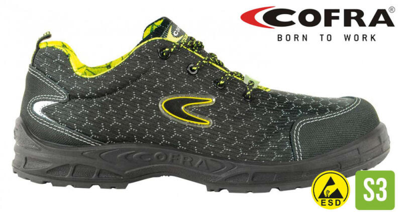 Fekete színű munkavédelmi cipő, fluo sárga belső szövettel, kompozit orrvédővel, APT átszúrás elleni talplemezzel. ESD védelemmel ellátott munkavédelmi cipő, fekete nylon lélegző, vízlepergető felsőrésszel. S3-as védelmi képesség, széles méretválaszték! Cofra Mykonos S3 ESD Munkavédelmi Cipő Utcára is alkalmas megjelenésű, nagyon kényelmes, könnyed ESD védelemm