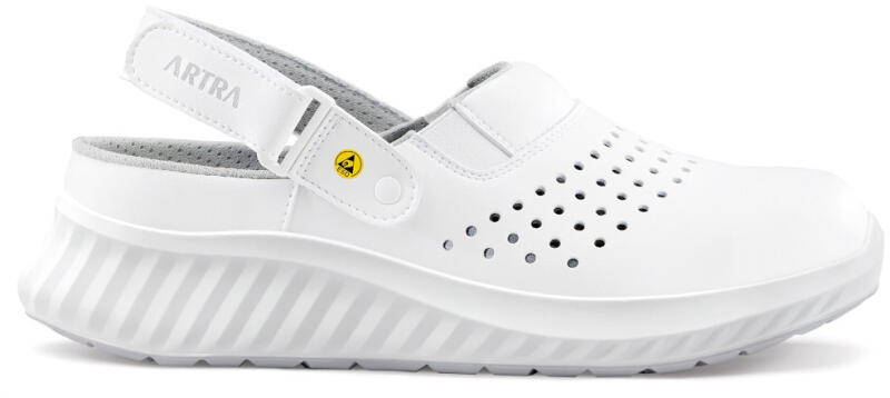 Kiváló légáteresztő képességgel és hidrofób mikroszálas felsőrésszel rendelkező kényelmes ESD-s munkavédelmi szandál. Kiváló választás egészségügyi és élelmiszeripari dolgozóknak egyaránt. Felsőrész A cipő felső része hidrofób mikroszálas 2.2 mm vastag MICRO PRO bőrből készült, mely kiváló ellenállóképességet biztosít, valamint jó légáteresztő képe