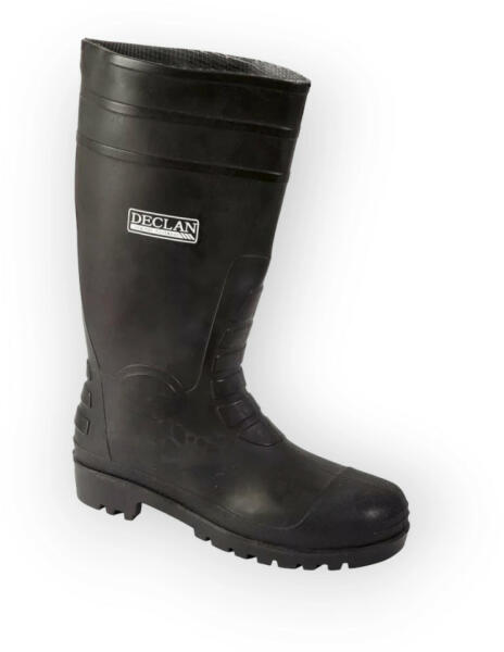 EN 20347 S5 SRC EN 13832-3 nagy ellenállású PVC felsőrész csúszásmentes kaucsuk gumi talp acél orrmerevítő és talpátszúrás elleni lemez széles lábfej-kialakítás pamut harisnya talpbetét, csizmabélés belehelyezhető hosszú élettartam kényelmes viselet fekete színben EN 20347 S5 SRC EN 13832-3