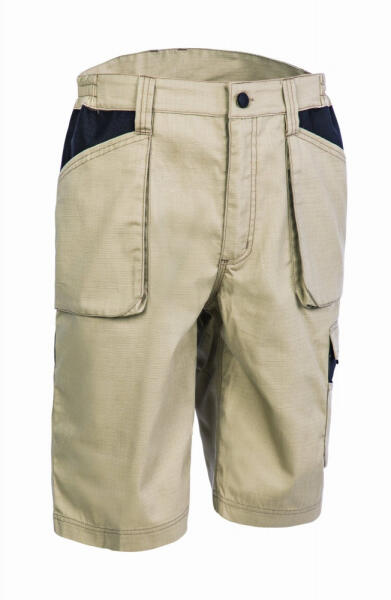 OROSI Ripstop rövidnadrág 5ORS010 fekete 5ORS020 bézs 240 g/m2 vastag, 35% pamut 65% poliészter kevertszálas ripstop (továbbszakadás biztos) alapanyag kopásálló Oxford 600D PES betétekkel megerősített erősebben igénybe vett területek: zsebek körüli részek stb. modern formai kialakítás, szerelők számára kifejlesztve övbújtatók, biztonsági tripla varrás és megemelt hát