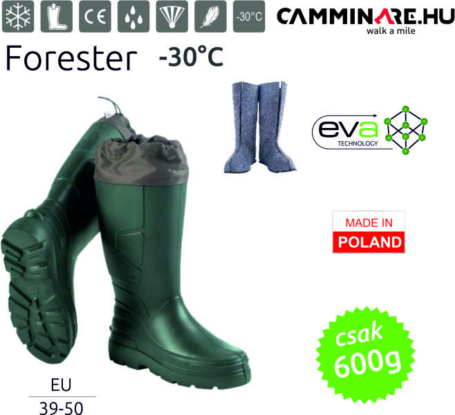 Pille könnyű, kiváló hőszigetelő képesség, különösen erős ellenálló anyag, EVA technológia, maximális hideg elleni védelem, csúszásmentes talp, 100%-os komfort érzet, vízálló. Kivehető és mosható bélés, bélés nélkül NYÁRON is használható. Normál, magas behúzható szárral.